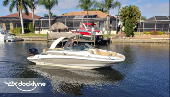 Rent a boat to explore Cape Coral and SWFL on water, with this 24'3" Crownline E4 XS Bowrider boat featuring a 250 HP Yamaha Vmax outboard motor. This Crownline rental boat features a Garmin Marine GPS with digital depth sounder, 2 freshwater showers (front and rear), an on-board sink, on-board head with electric flush system, on-board cockpit tabl...
