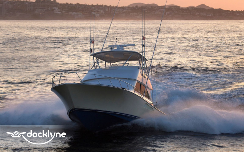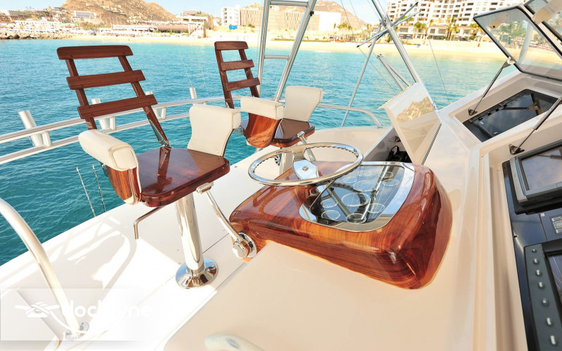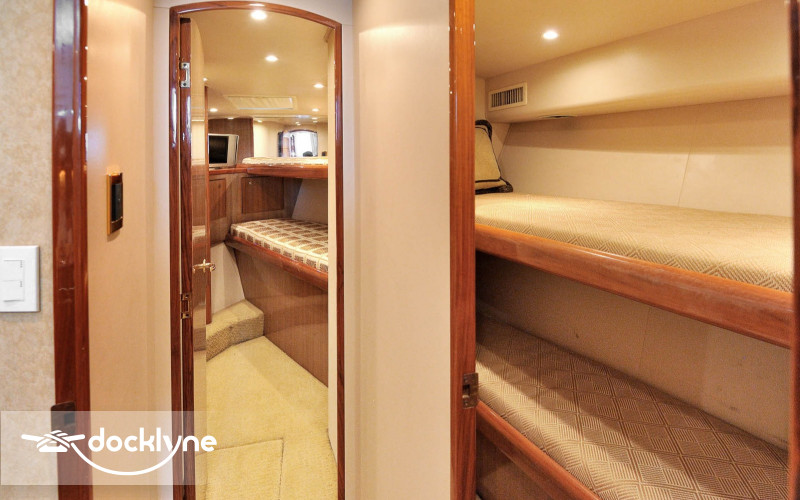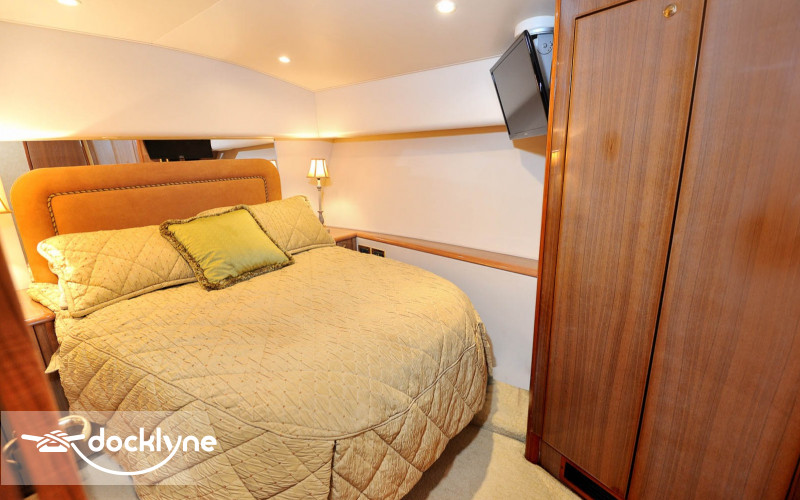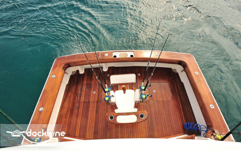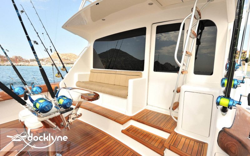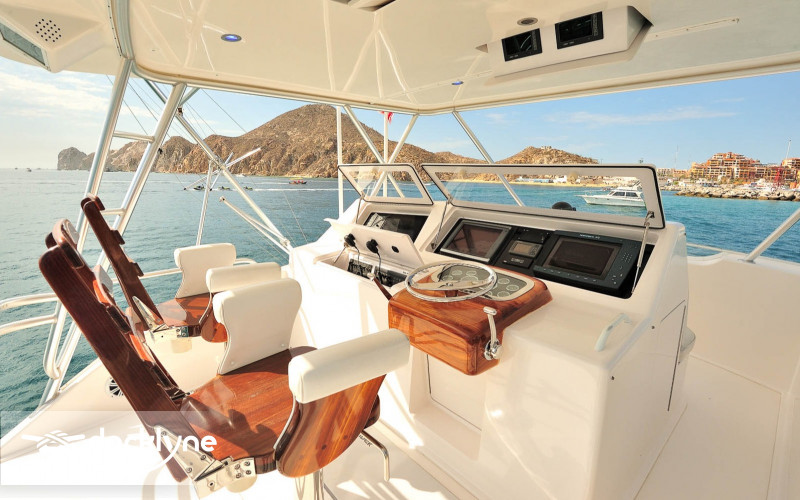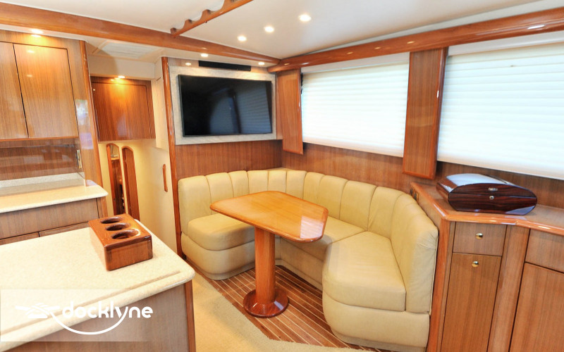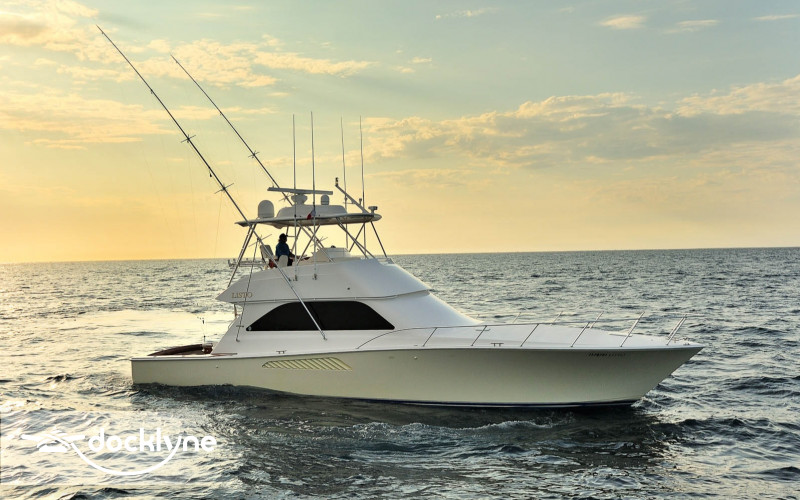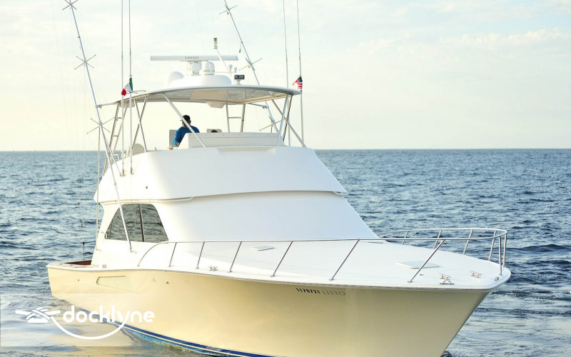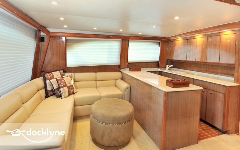 This immaculate Viking is quite a head turner. Her eye-catching pale yellow hull and top of the line electronics make Listo perfect for the serious professional fisherman seeking the best in comfort. Twin 2200 HP Mann engines provide a top speed of 44 knots. Electronic trolling valves are included. The spacious cockpit provides mezzanine seating, the ideal spot to be first in the fighting chair or to observe the fishing action up close. The cockpit has a recessed fish box and freezer, Rupp outriggers, a professional fighting chair, large live bait well, an ice machine, tackle, and a bait center with an extensive assortment of trolling lures. The interior is finished in high-gloss cherry wood with full air conditioning throughout. The salon is clean and uncluttered and has an L-shaped couch arrangement, a dinette, a 42 inch plasma TV, an entertainment center, a cigar humidor, and tasteful decorative accents.