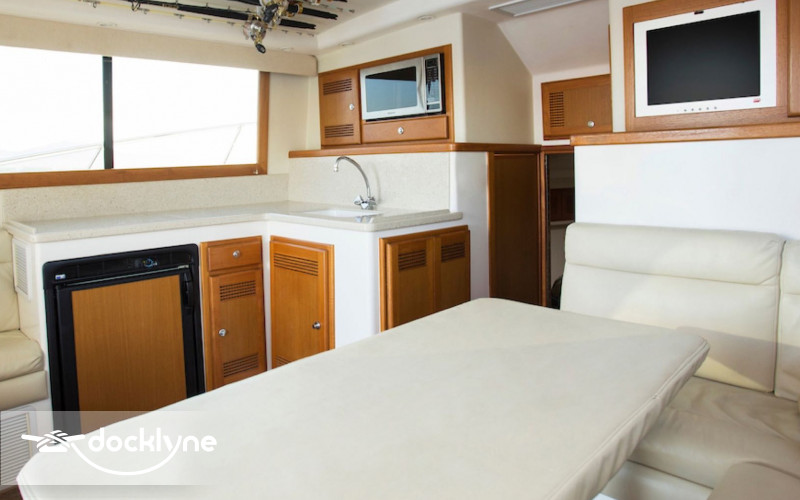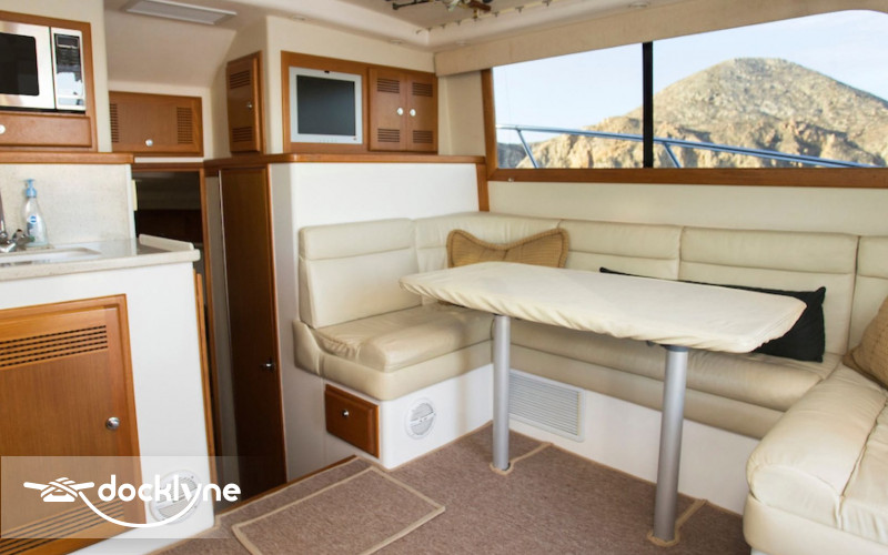 KNOT WORKIN is an impeccable 35 FT 2004 Cabo Flybridge, offering comfort and performance for groups of up to six guests. Caterpillar 3126 twin engines offer a top speed of 34 knots and cruising at 22 knots. Considered one of the best sport fishers every built, this model is designed specifically to fish the waters off of Cabo San Lucas. The spacious cockpit has a professional fighting chair, live bait well and tackle center, as well as refrigerated fish box and shaded seating outside. The salon has cream colored couch, dinette for six & compact galley, as well as T.V and sound system. A squeaky clean bathroom is featured on the starboard side next to one of two guest cabins. The forward cabin has a queen size bed with Tommy Bahama bed covering. The flybridge is shaded and has seating for several guests. Full electronics including radar, sonar & GPS as well as a full complement of Shimano & Penn tackle ranging from 20 to 80 lb. class. The overall condition of Knot Working is excellent.