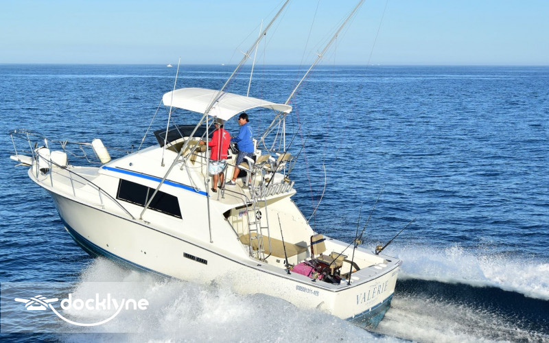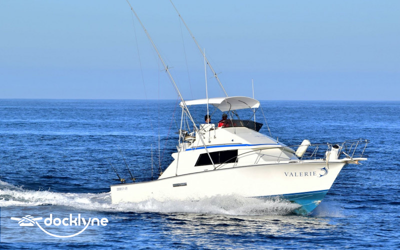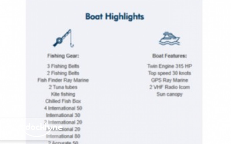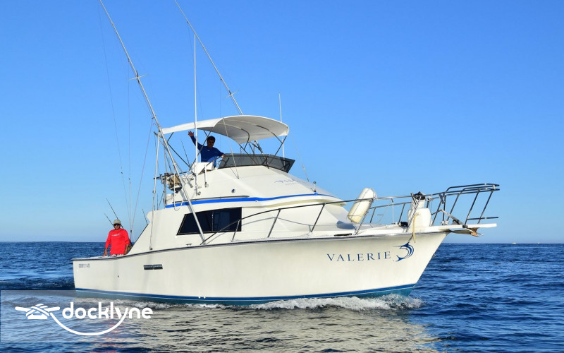 This vessel offers a lot more than the standard cruiser while still being affordable. Refitted in 2014 with new Turbo Cummins 315 engines for extra speed. Cabin has dining area, small galley with bathroom, shaded sitting areas both on the fly bridge and in the cockpit Tuna Tubes, GPS, Water Temp. Gauge, full selection on Penn International tackle.
