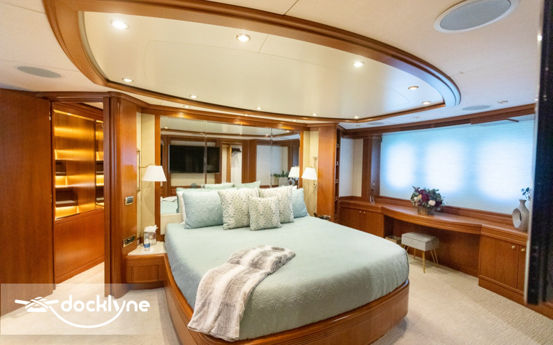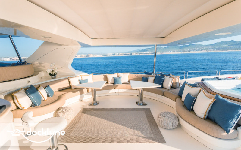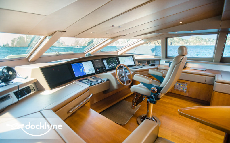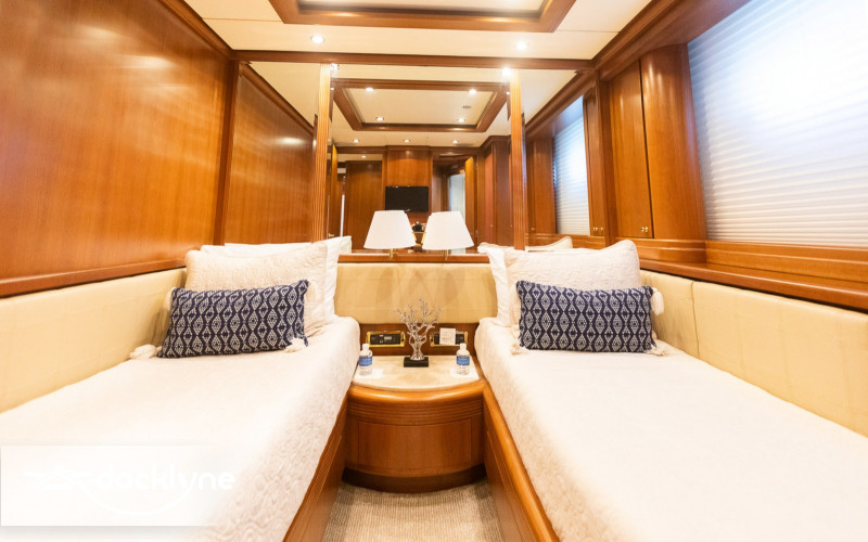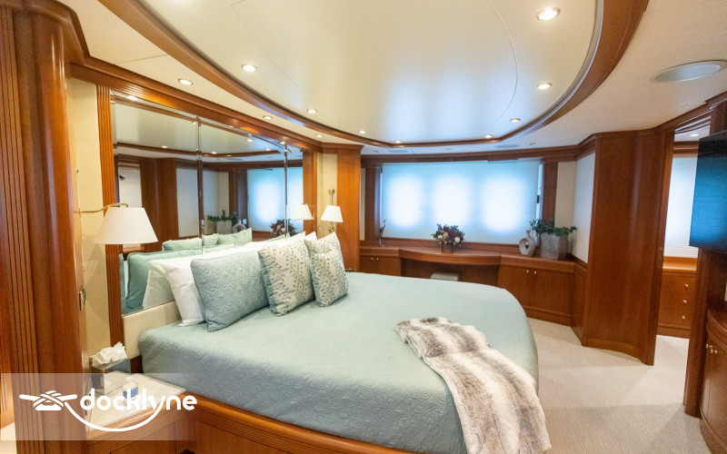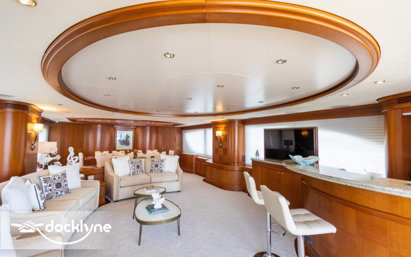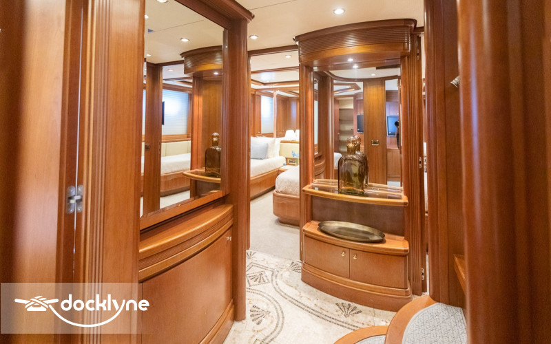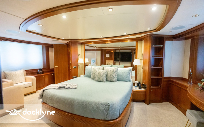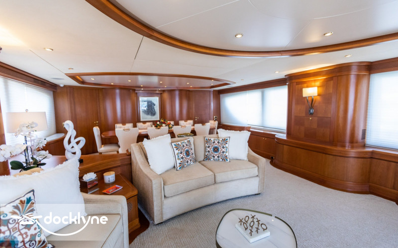 This fine yacht features a commodious aft deck with dining for 12, a comfortable salon with a full wet bar and dining for 10, a full beam main stateroom with a rain shower and a jacuzzi bathtub, five staterooms total with full bathrooms boasting marble accents, and four crew cabins.