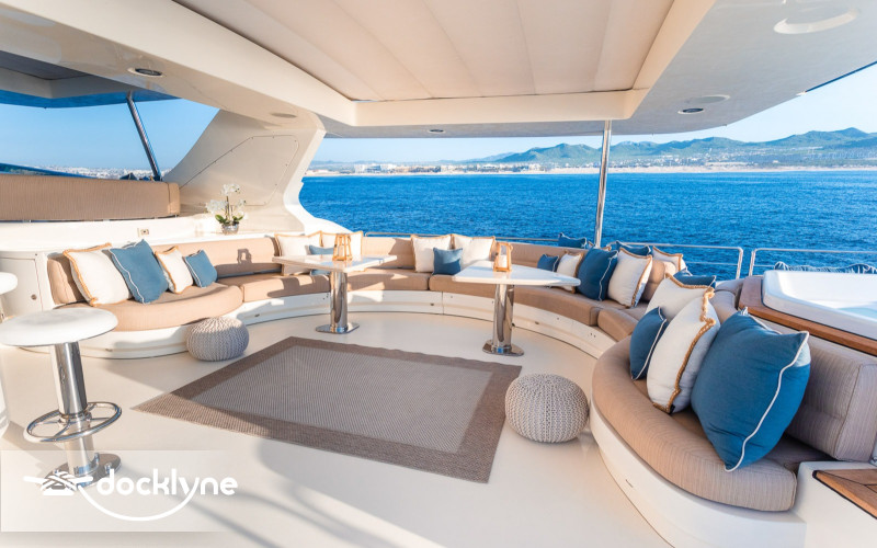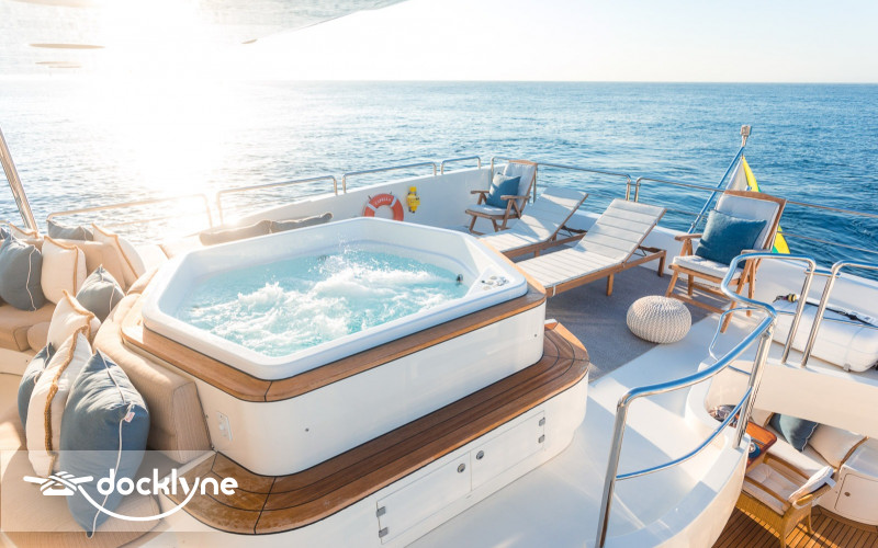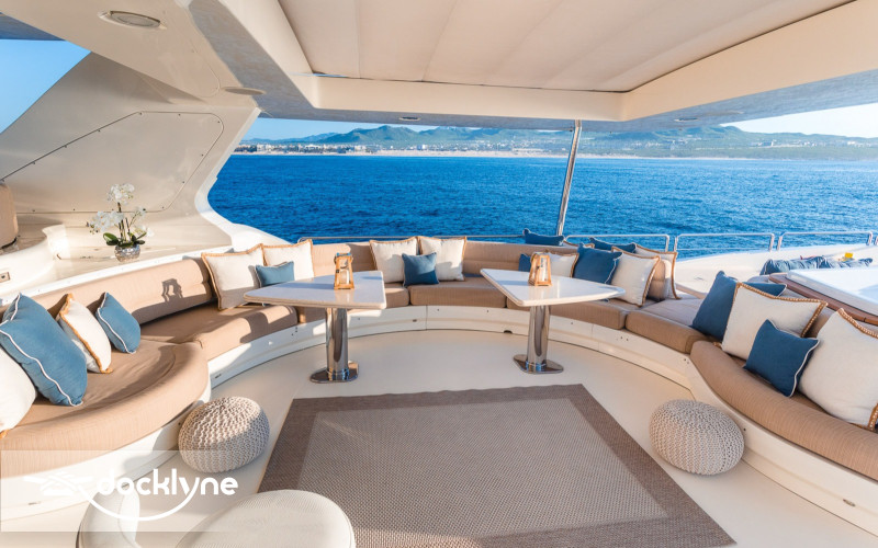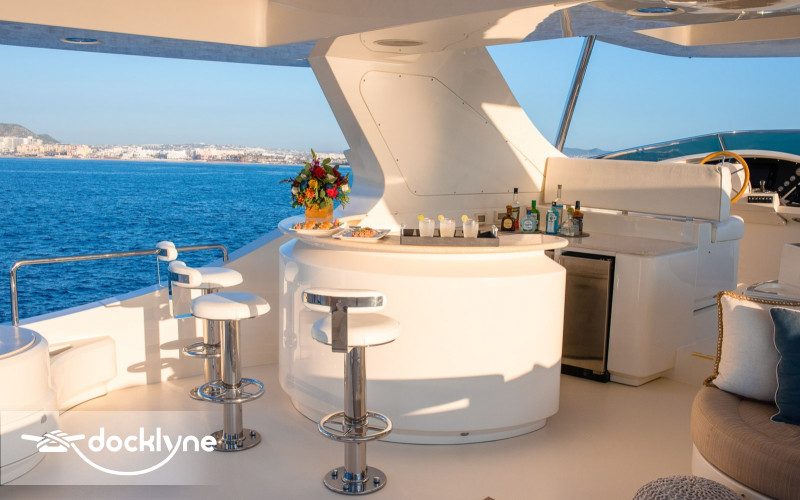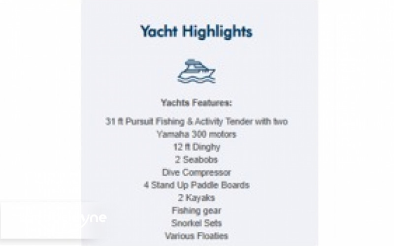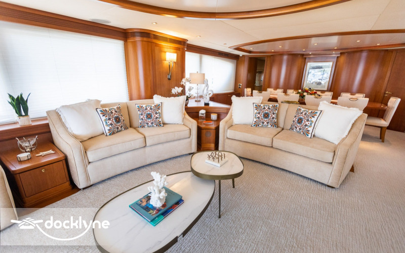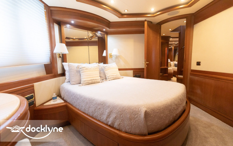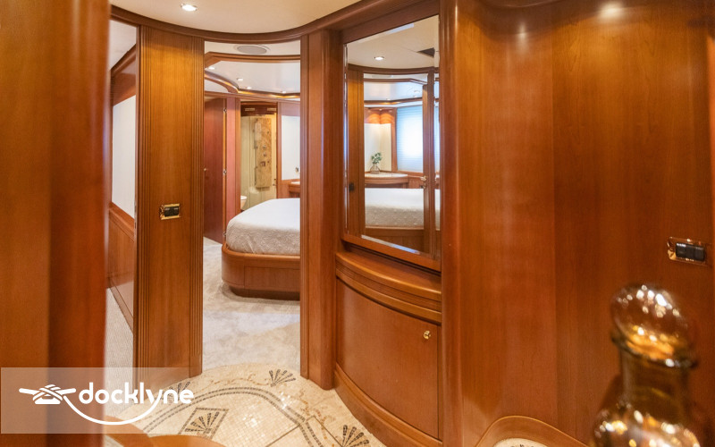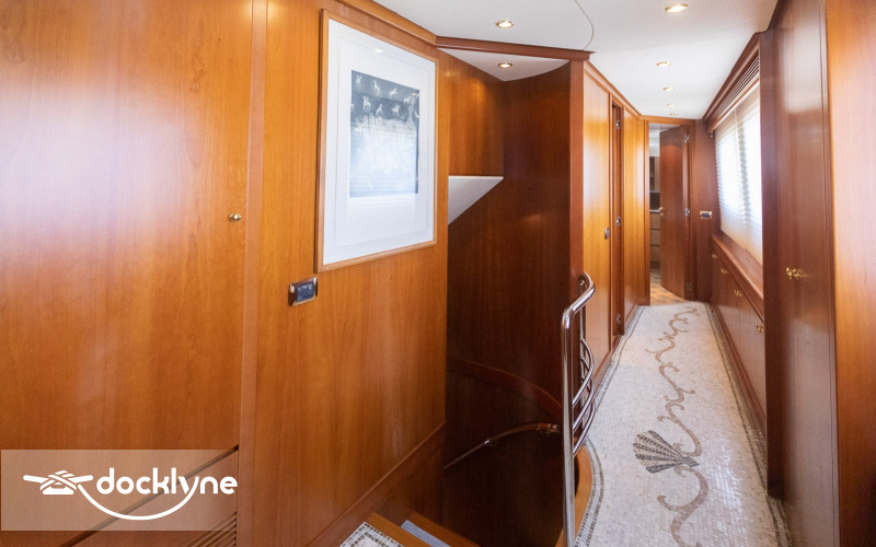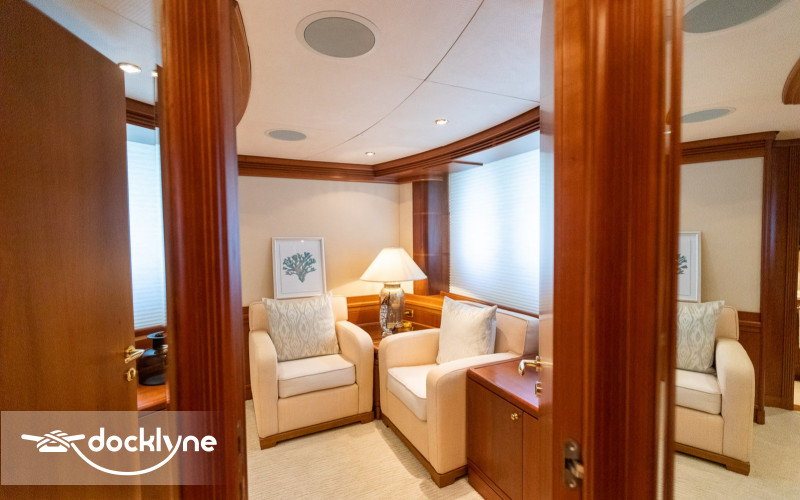 This fine yacht features a commodious aft deck with dining for 12, a comfortable salon with a full wet bar and dining for 10, a full beam main stateroom with a rain shower and a jacuzzi bathtub, five staterooms total with full bathrooms boasting marble accents, and four crew cabins.