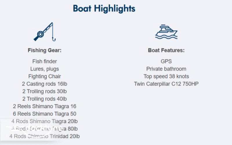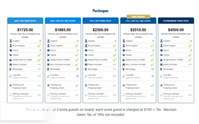This boat allows for 2 extra guests on board; each extra guest is charged at $70 + Tax. This charge includes a Box lunch and 6 Drinks per person. Mexican Sales Tax of 16% not included..