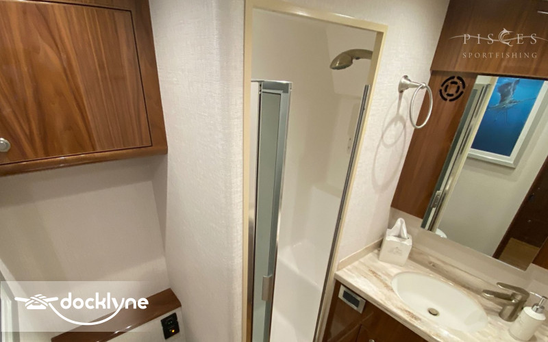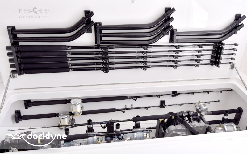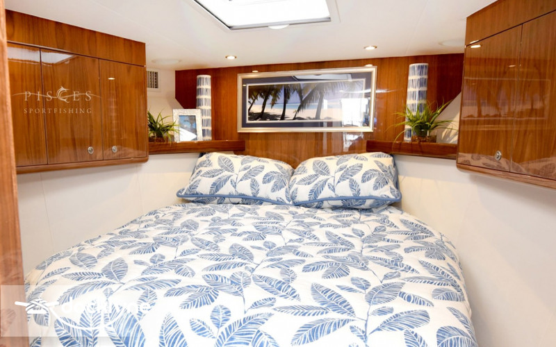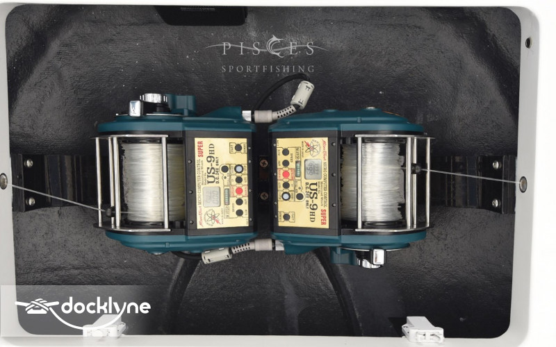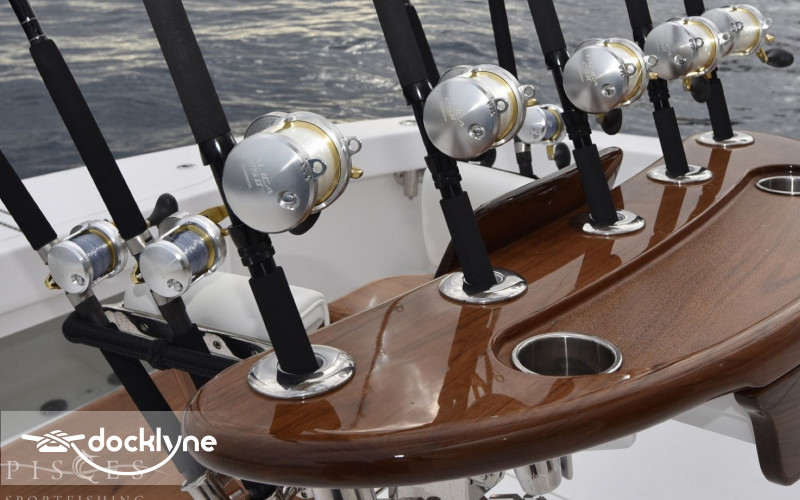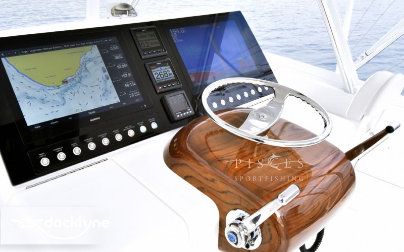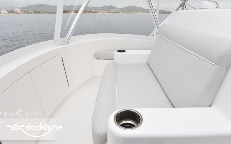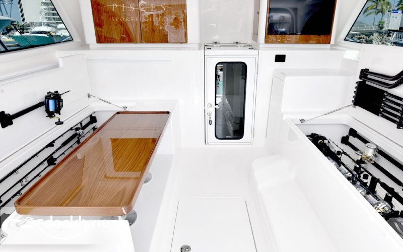 The 140-square-foot cockpit has room for the entire crew or family. Standard equipment and features include a cockpit bait freezer with upper tray, in-deck insulated fish boxes port and starboard with overboard drainage, a walk-through transom door and lift gate, a transom fish box and live well, additional live well on bow, rod holders, tackle sto...