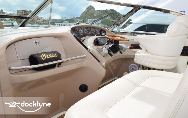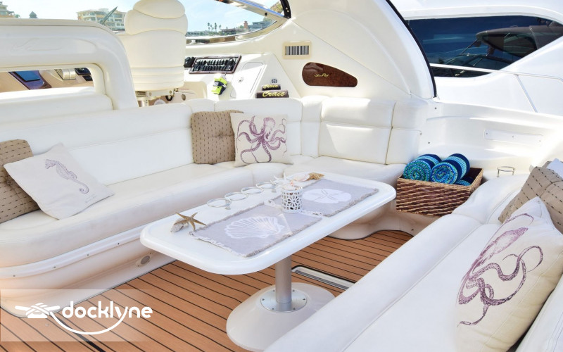 This beautiful sports yacht surpasses all expectations. Her interior 7-foot head room throughout the downstairs salon along with outdoor cockpit seating for 12 makes this yacht truly the largest most comfortable yacht in its class. Starting aft, the large swim platform is hydraulic and can be lowered to sit in the water. The aft deck has a white “U” shaped seating arrangement with 22” Flat Screen TV for all to see. This epicenter of fun is further offset with teak looking carpet that is soft on the feet. The center cockpit table is the perfect size to enjoy a wonderfully prepared breakfast or a champagne toast and appetizers during sunset. Part of the cockpit seating further electrically converts to a large 2-3 person lay flat sun pad. A wet bar and ice maker are built in to make entertaining easy.