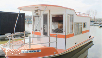 Welcome to The Captains Quarters - a retro houseboat! This unique floating getaway offers large viewing windows along with two twin beds and two poofs for when you want to put your feet up.