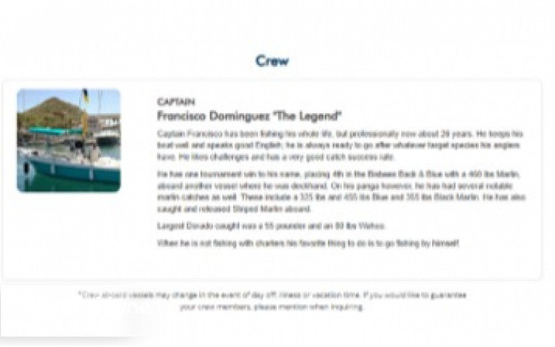 To keep pace with the times and the growth of a more sophisticated market we have gradually added more vessels and can now offer everything from the basic Baja Panga (skiff with outboard motor) to mega yachts. Still the favorite of most Cabo visitors are our Standard cruisers, seaworthy, clean boats between 28 and 31 feet, with very experienced crews which are great value for money.